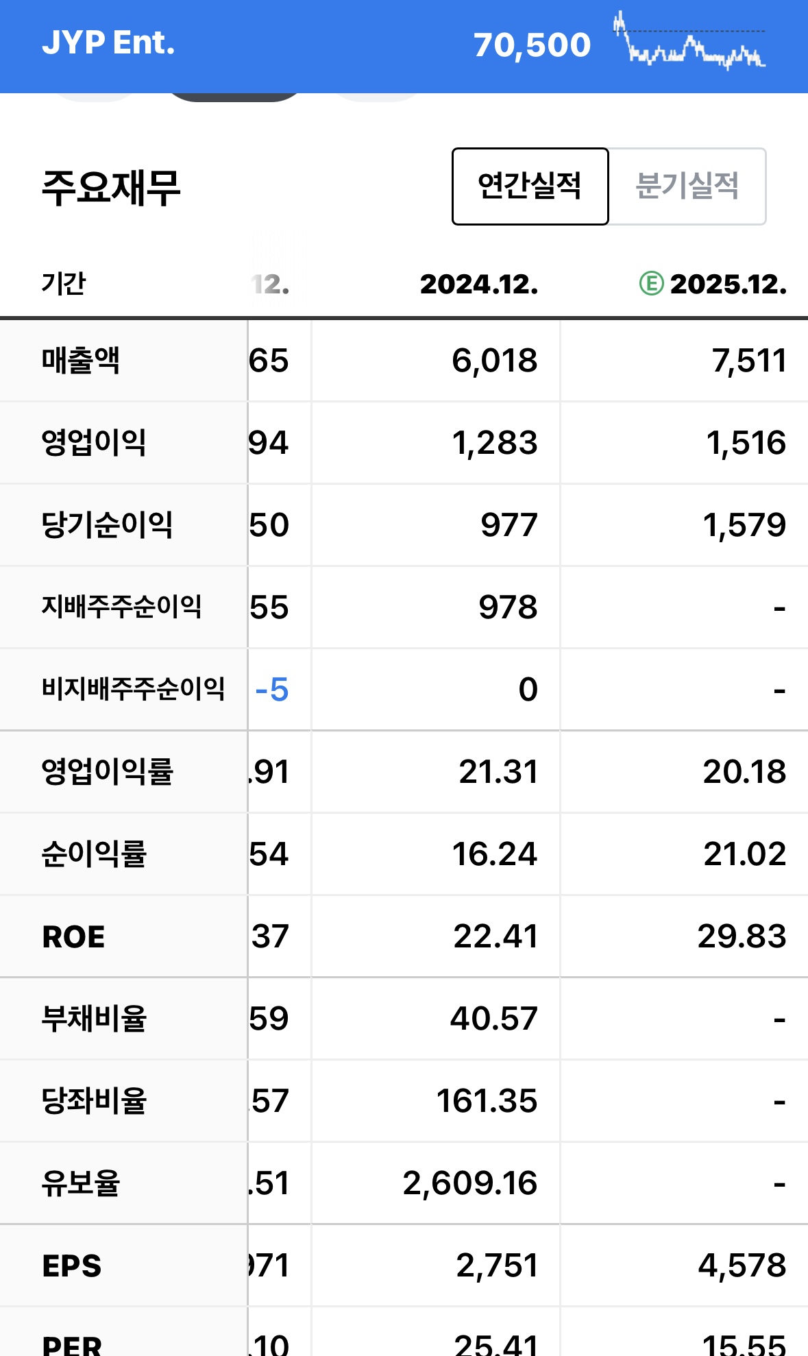 출처 [1] JYP 엔터테인먼트 - 위키백과, 우리 모두의 백과사전 https://ko.wikipedia.org/wiki/JYP_%EC%97%94%ED%84%B0%ED%85%8C%EC%9D%B8%EB%A8%BC%ED%8A%B8 [2] 엔터주 총정리 TOP10 | 관련주, 대장주 전망 https://stockstalker.co.kr/entertainment/ [3] JYP Ent.[기업개요] 글로벌 팬덤 활용해 일본·중국 동시공략하는 법 https://contents.premium.naver.com/a18382/prism/contents/250615110437357pq [4] [PDF] JYP Ent.(035900) - 한국IR협의회 https://w4.kirs.or.kr/download/research/250428_JYP%20Ent(%EA%B8%80%EC%84%B8)_%EC%B5%9C%EC%A2%85.pdf [5] [PDF] 2023 JYP엔터테인먼트 지속가능경영보고서 - NET https://jyplevel1storage01.blob.core.windows.net/jypedoc/2023%20JYP%EC%97%94%ED%84%B0%ED%85%8C%EC%9D%B8%EB%A8%BC%ED%8A%B8%20%EC%A7%80%EC%86%8D%EA%B0%80%EB%8A%A5%EA%B2%BD%EC%98%81%EB%B3%B4%EA%B3%A0%EC%84%9C(%EA%B5%AD%EB%AC%B8).pdf [6] [PDF] JYP Ent. (035900) - iM증권 https://m.imfnsec.com:442/upload/R_E08/2025/03/%5B25215647%5D_035900.pdf [7] [PDF] JYP Ent.(035900) - 삼성증권 https://www.samsungpop.com/common.do?cmd=down&contentType=application%2Fpdf&inlineYn=Y&saveKey=research.pdf&fileName=2010%2F2025042116250040K_02_02.pdf [8] “모델은 제니·노래는 테디”…난리 난 '데몬 헌터스', 케이팝 디테일의 비결 https://sports.donga.com/ent/article/all/20250624/131874075/1 [9] 케이팝 데몬 헌터스 관련주 TOP10 | 국내 대장주 - 주식스토커 https://stockstalker.co.kr/kpop-demon-hunters/ [10] [JYP Ent.] 사업보고서(일반법인) - 상장공시시스템(KIND) - 한국거래소 https://kind.krx.co.kr/common/disclsviewer.do?method=search&acptno=20250317000723&rcpno=20250317000598&orgid=F&tran=Y&langTpCd=0 [11] JYP 엔터테인먼트 CEO는 누구인가요? 좋은 CEO라고 생각 ... https://translate.google.com/translate?u=https%3A%2F%2Fwww.quora.com%2FWho-is-the-CEO-of-JYP-Entertainment-Do-you-think-he-or-she-is-a-good-CEO&sl=en&tl=ko&client=srp [12] [특징주] JYP Ent. (035900), 아티스트 리스크 해소…보이 ... https://www.incheonilbo.com/news/articleView.html?idxno=1271653 [13] [실적속보]JYP Ent., 올해 1Q 매출액 1408억(+3.1%) 영업이익 196억 https://m.thinkpool.com/stockDiscuss/035900/cont/11788252 [14] JYP Entertainment Corp (035900) 재무 요약 - 인베스팅닷컴 https://kr.investing.com/equities/jyp-entertainment-corp-financial-summary [15] JYP Ent.(A035900) | Snapshot | 기업정보 | Company Guide - 삼성전자 https://comp.fnguide.com/SVO2/ASP/SVD_Main.asp?gicode=A035900 [16] K컬처 中시장 공략 기대감…엔터주 시간 이어진다 https://www.etoday.co.kr/news/view/2476736 [17] JYP Ent., 1분기 매출 1, 408억·영업이익 196억…2025년 주가 향방은? https://seo.goover.ai/report/202506/go-public-report-ko-717c9d98-f28d-40e6-ad28-3c89e178418f-0-0.html [18] JYP Ent.의 주가와 산업 동향: 안정성과 성장 가능성을 동시에 고려한 ... https://seo.goover.ai/report/202505/go-public-report-ko-ee046567-bce3-4b65-863a-bc65255ded02-0-0.html [19] (엔터 확장 딜레마)④JYP, 구조조정과 확장 사이 '묘수 찾기' https://www.ibtomato.com/mobile/mView.aspx?no=14600 [20] JYP엔터테인먼트 - 위키피디아 https://translate.google.com/translate?u=https%3A%2F%2Fen.wikipedia.org%2Fwiki%2FJYP_Entertainment&sl=en&tl=ko&client=srp