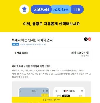 기존 톡서랍 플러스는 100GB(월 1,900원), 250GB(월 3,900원), 500GB(월 6,900원), 1TB(월 8,900원) 등 4단계로 운영됐습니다. 그러나 2025년 8월 21일부터는 아래와 같이 4단계 새로운 요금 체계로 완전히 개편됩니다.