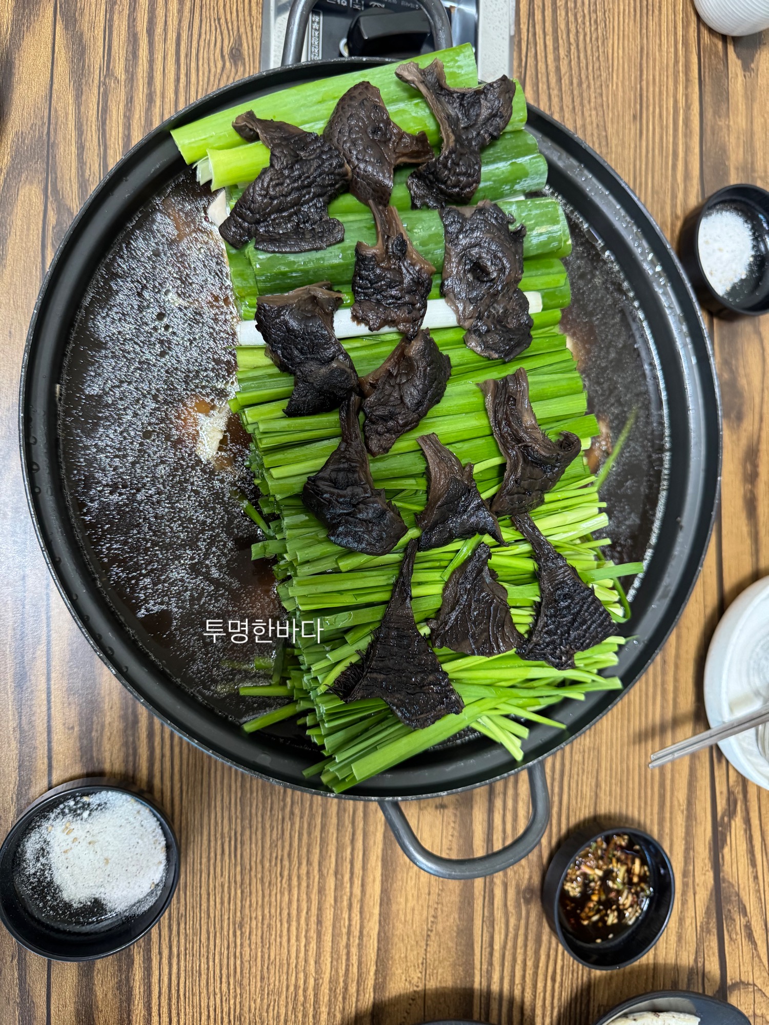 초콜릿처럼 깊은 국물, 부드러운 닭살, 그리고 그 위에 올라가는 깻잎, 부추, 소금물의 간단한 조합이 맛의 균형을 맞춥니다.