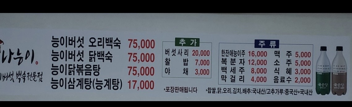 자, 메인 메뉴는 단연 능이버섯닭백숙과 능이버섯오리백숙!