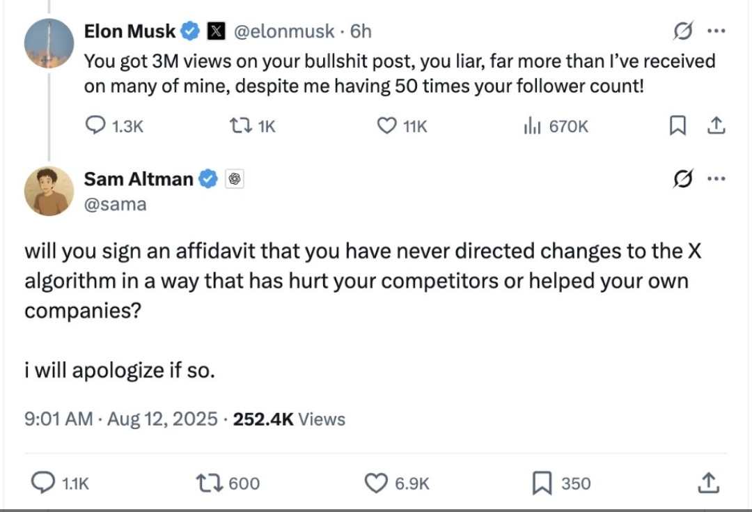 - 이에 샘 알트먼(OpenAI CEO)은 “머스크가 X 알고리즘을 자신과 자기 회사에 유리하게, 경쟁사에 불리하게 조정한다는 각종 의혹이 있는데 애플을 비난하는 것은 놀랍다”고 맞받았고, 이후 머스크가 알트먼을 “거짓말쟁이”라고 공격하자 “경쟁사를 해치거나 본인 회사에 이익이 되도록 X 알고리즘 변경을 지시한 적이 ‘절대 없다’는 내용의 선서진술서(affidavit)에 서명하라, 그러면 사과하겠다”고 공개적으로 도전했다[4][5][6].