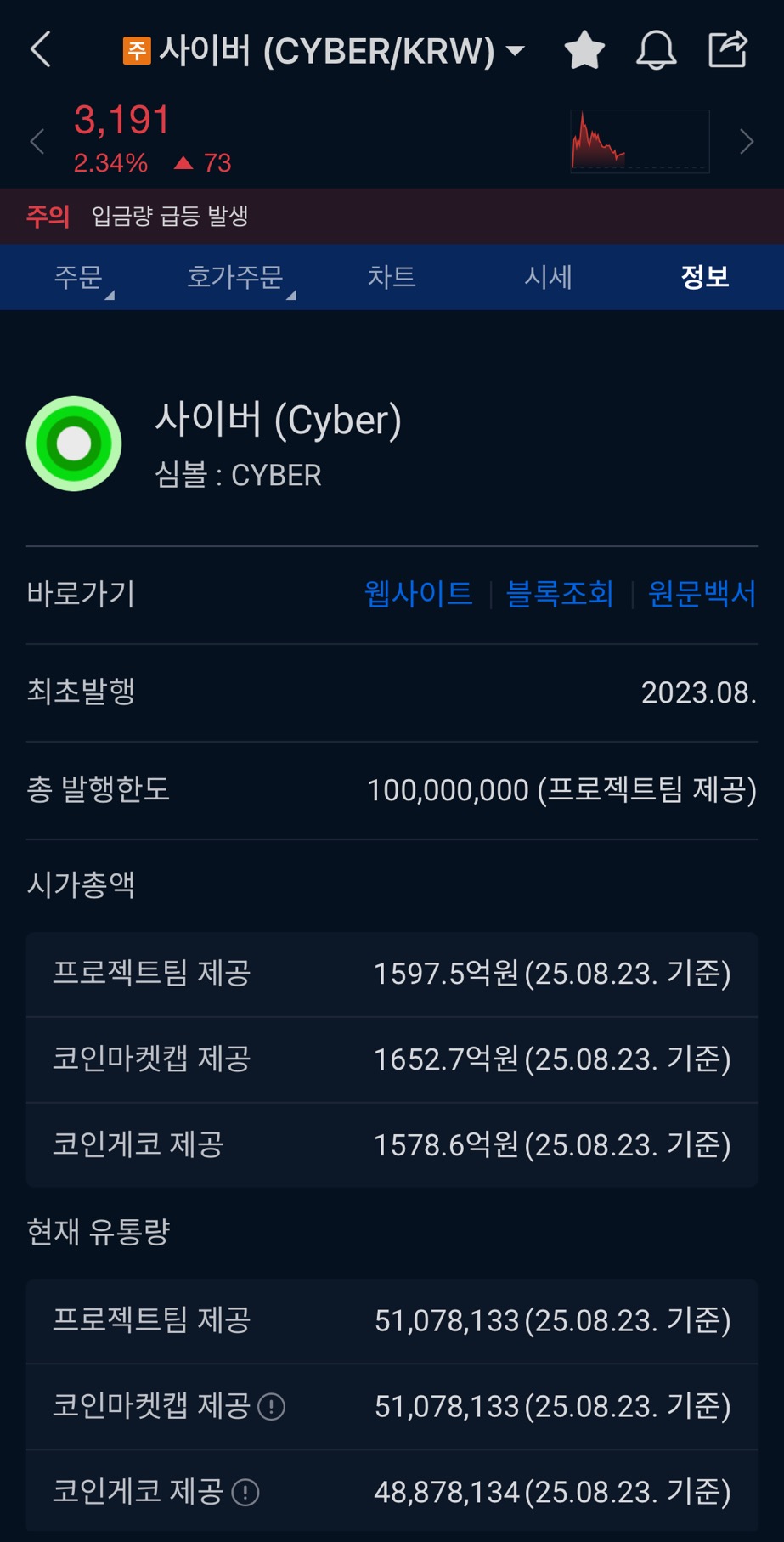 둘째, 상장 거래소 현황을 보면, CYBER는 바이낸스, 업비트, 코인원, MEXC 글로벌, 게이트, HTX 등 글로벌 주요 거래소 대부분에 상장되어 있습니다. 특히 바이낸스와 국내 거래소의 강력한 유동성은 안정적인 시장 접근성을 보장하며, 국제적 수요 증폭을 통해 장기적으로 좋은 상승 모멘텀을 기대할 수 있습니다[9][10].