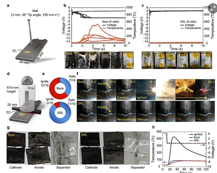 SRL은 외부 퓨즈나 외부 회로가 아닌, 배터리 셀 내부에 바로 적용되는 ‘활성 보호막’입니다. 물리적 충격(못 박기, 천공, 충격, 파열 등)으로 인한 내부 쇼트, 과충전, 과방전, 고온 환경 등 다양한 배터리 결함 상황에서 발열이 일어나면 초기 단계에서 즉시 전류를 차단하므로, 배터리 화재 및 열폭주를 원천적으로 예방할 수 있습니다.