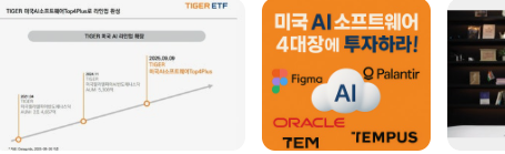 국내에서는 ‘TIGER 미국AI소프트웨어TOP4Plus ETF’가 팔란티어(25%), 오라클(15%), 피그마(15%), 앱플로빈(15%) 등 상위 70% 집중 투자 포트폴리오로, AI 소프트웨어 산업의 핵심 기업을 한눈에 볼 수 있게 만들었습니다.