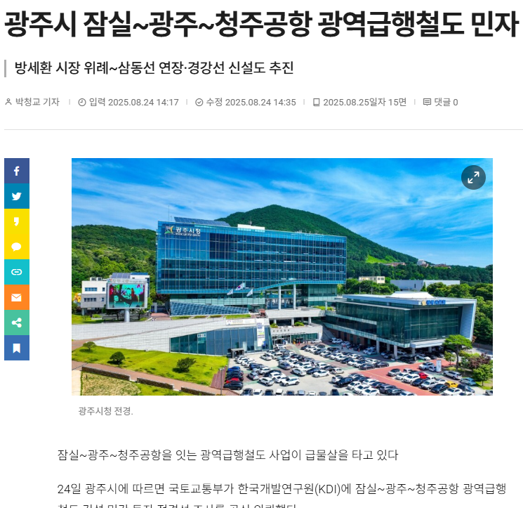 - 최근 국토교통부와 한국개발연구원(KDI)이 ‘잠실~광주~청주공항 광역급행철도’(GTX-D) 사업의 민간투자 적격성 조사에 착수하면서 광주는 철도망 확충에 대한 기대감이 급상승했습니다.