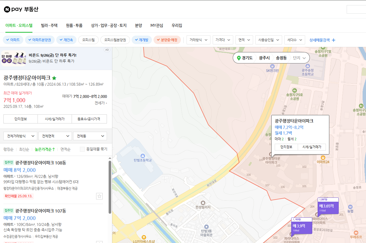 - 2025년 9월 기준 광주행정타운 아이파크 108㎡ 타입 거래가는 약 7억 원 초반대에 형성되어 신축 프리미엄과 광역 교통호재가 반영된 상승 국면입니다.