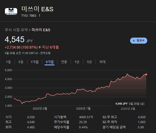미쓰이E&S 주가는 2025년 9월 현재 동사 최고가권 돌파, 사업구조 개편 효과가 주가에 본격적으로 적용되는 단계입니다.