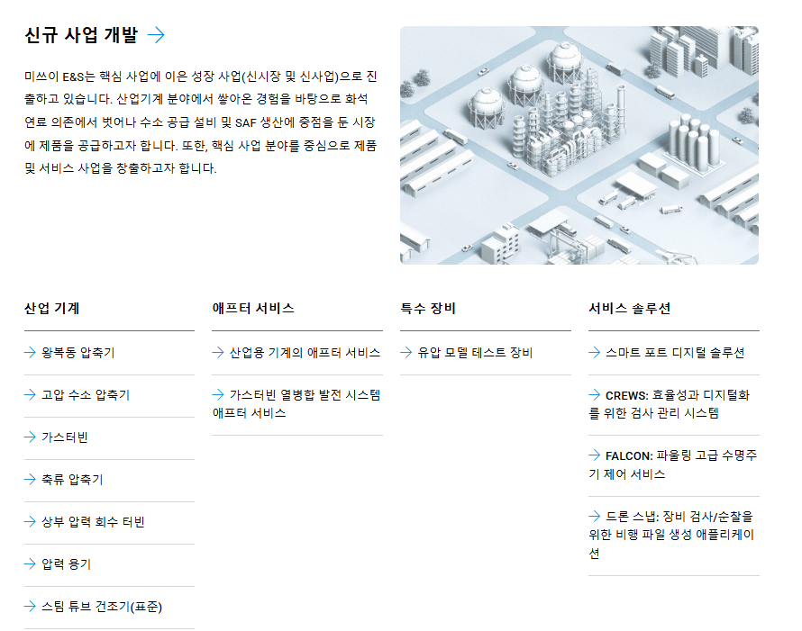 - 플랜트 및 엔지니어링: 발전소, 화학플랜트, 압력용기, 가스터빈 등 산업용 중장비의 설계·제작·유지보수 사업도 수행.