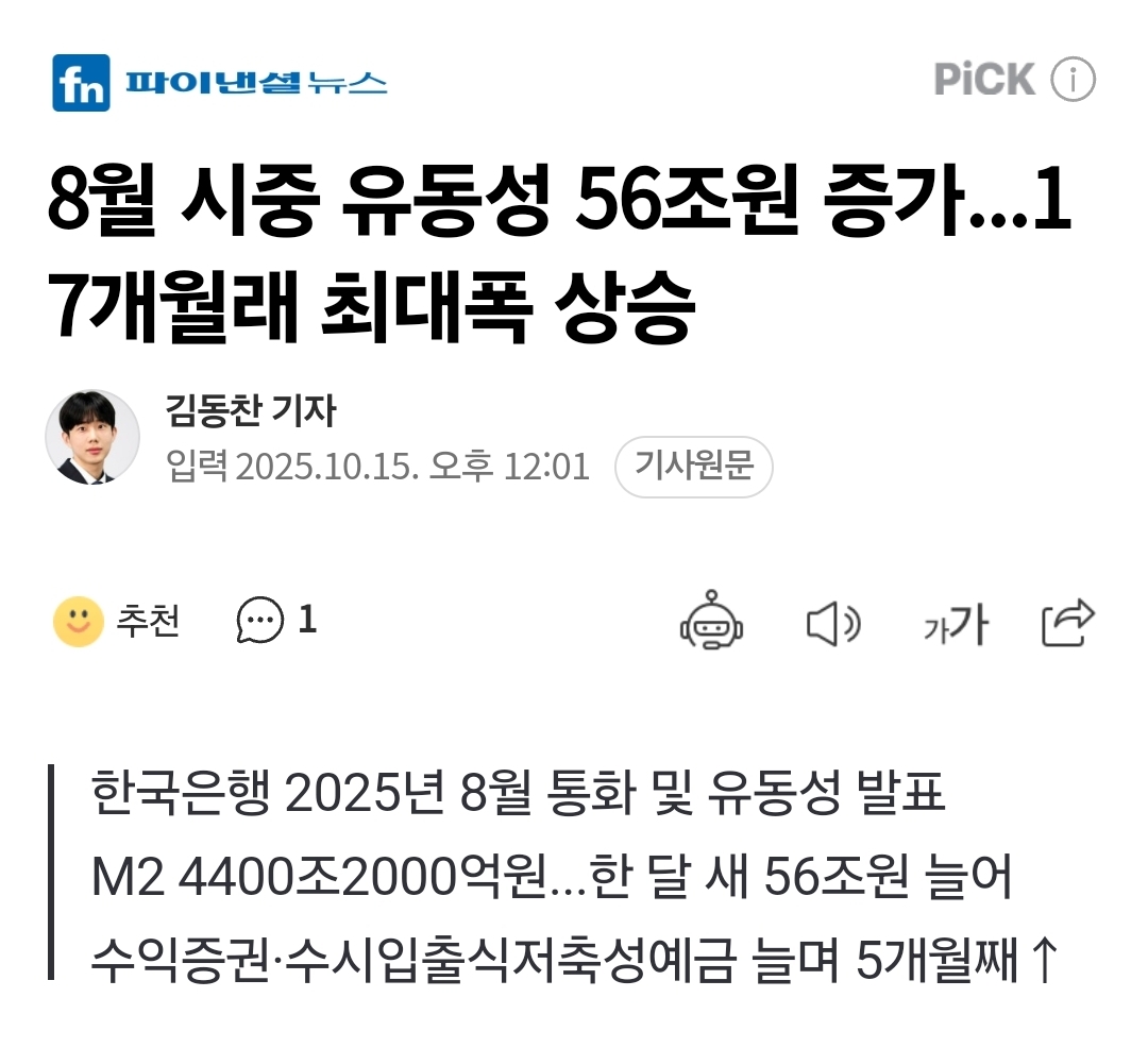 2025년 8월 통계와 기사, 그리고 연속적인 M2 증가율 추이를 종합해볼 때, 한국 경제는 유동성 확대 국면에 진입했으며, 이는 경기 회복과 성장세에 긍정적으로 작용할 수 있지만, 동시에 물가상승 압력과 시장불균형 리스크도 함께 커지고 있습니다. 향후 통화당국의 신속한 대응, 재정·금융 정책의 정밀함이 한국경제의 안정성과 지속가능한 성장의 방향을 결정하게 될 전망입니다.