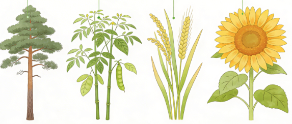 - Angiospermae (피자식물문): 꽃과 씨앗을 가진 식물군. 사과나무, 벼 등.