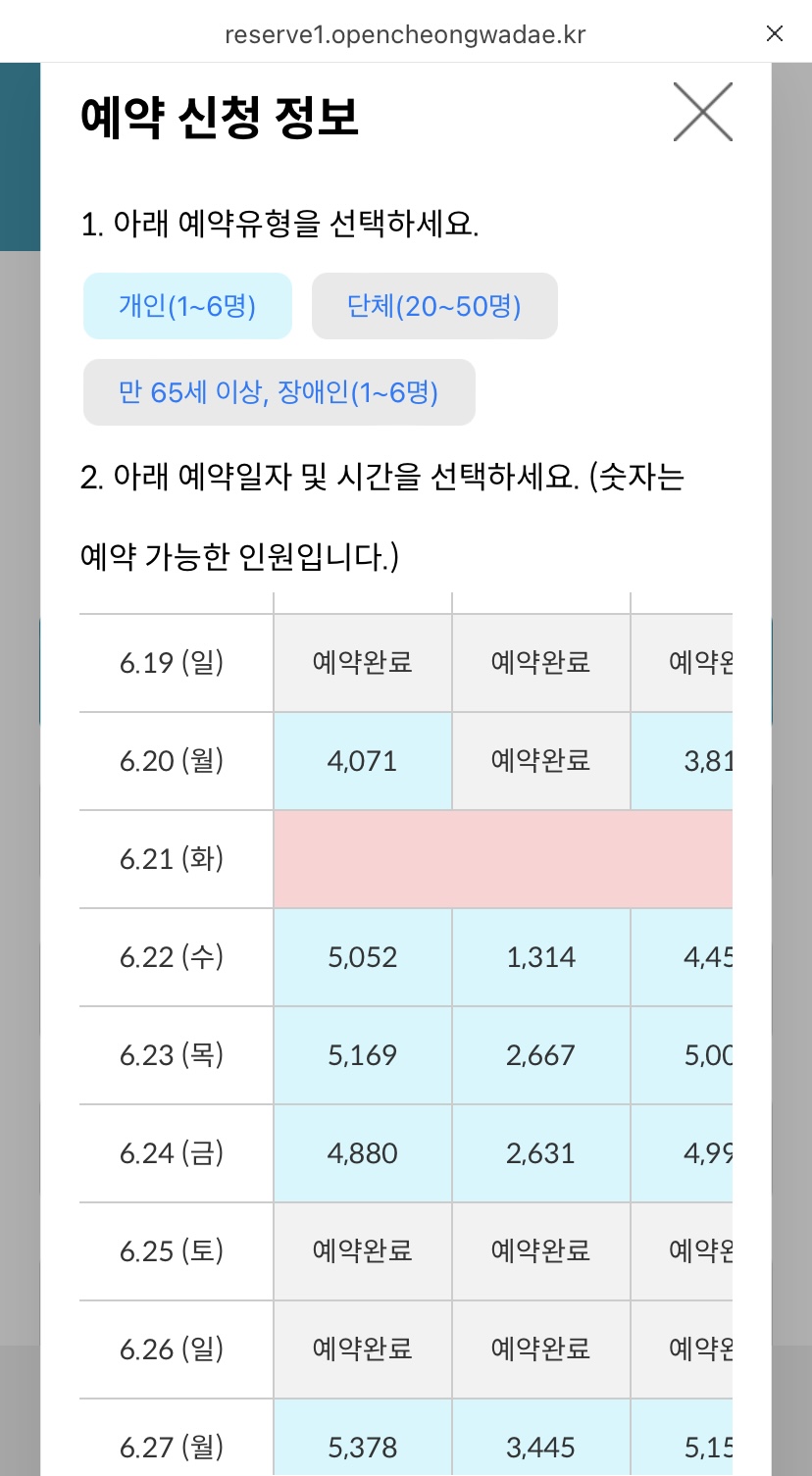 원하는 날짜, 인원수에 관림신청!! * 아래에 홈페이지 스크린샷을 참조하세요