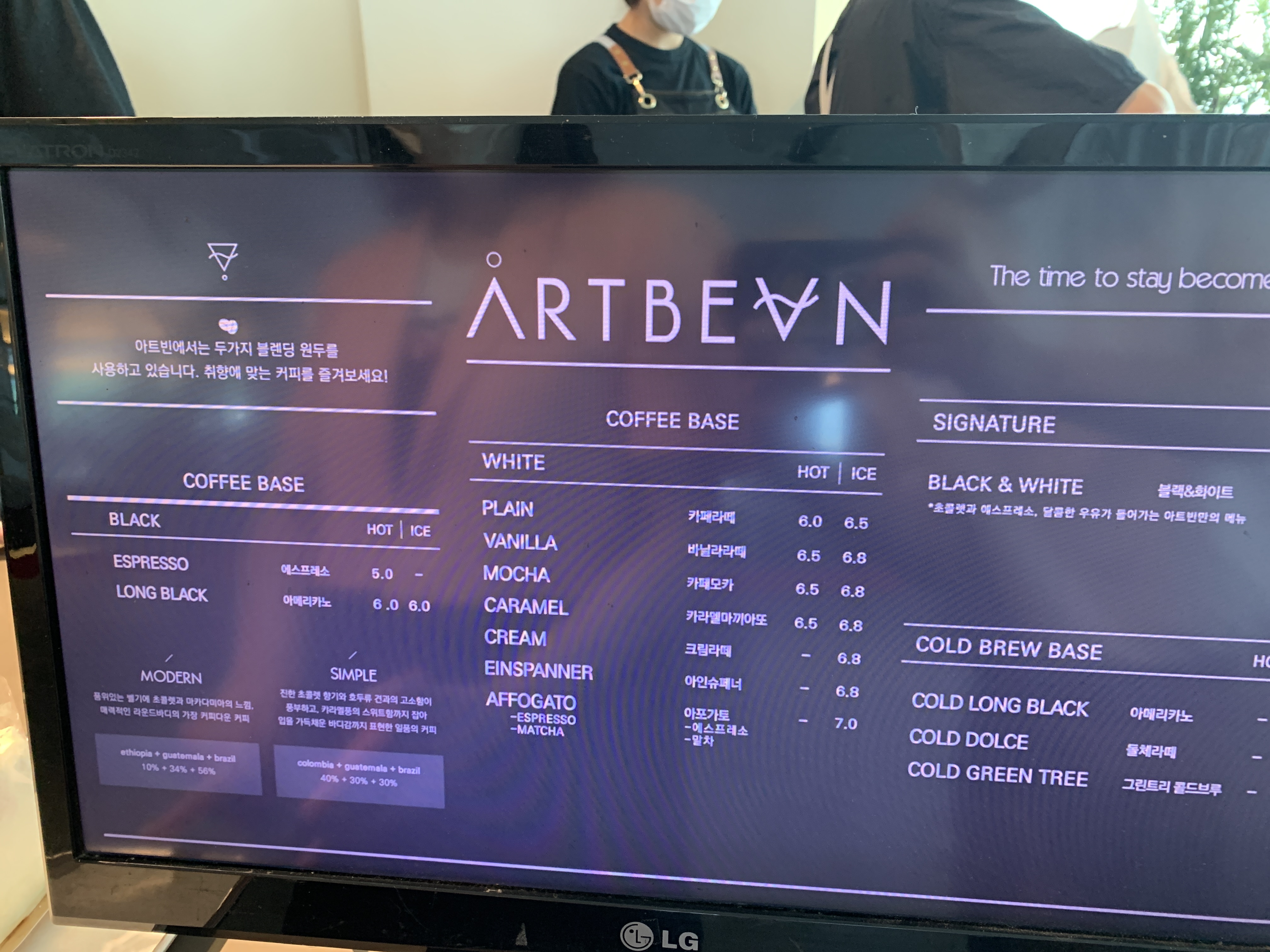 아트빈카페 메뉴 넓은 공간인 만큼 커피 및 음료 가격은 약간 비싼편