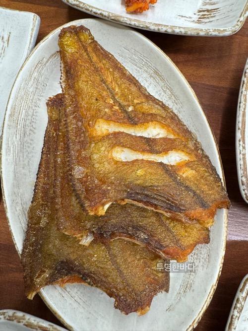 가자미 구이정식을 주문하면 통으로 튀긴 가자미가 나옵니다.