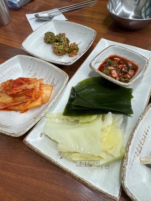 밑반이 세팅되었네요양배추찜 된장고추무침 김치가 너무 맛있었던 밑반찬