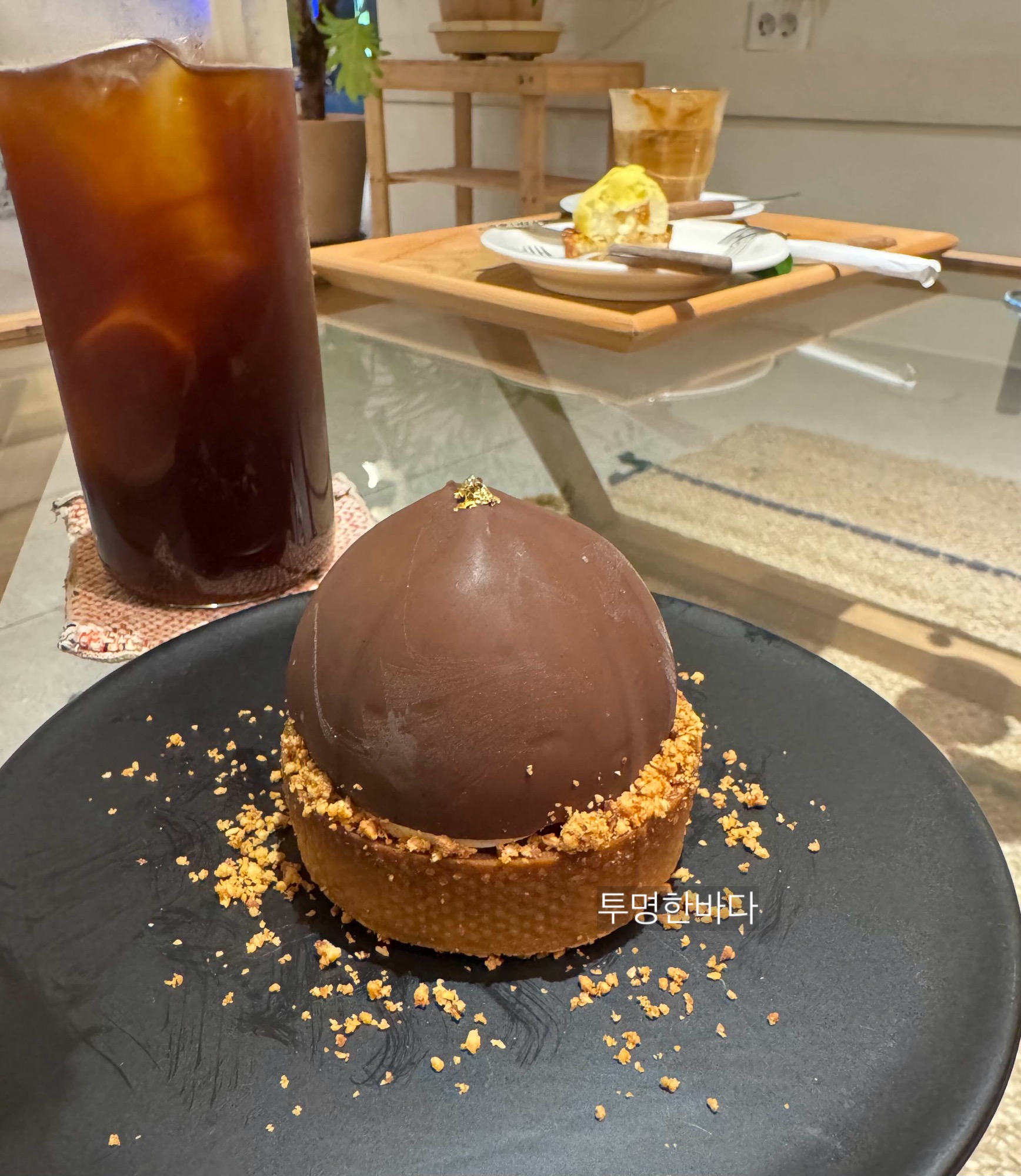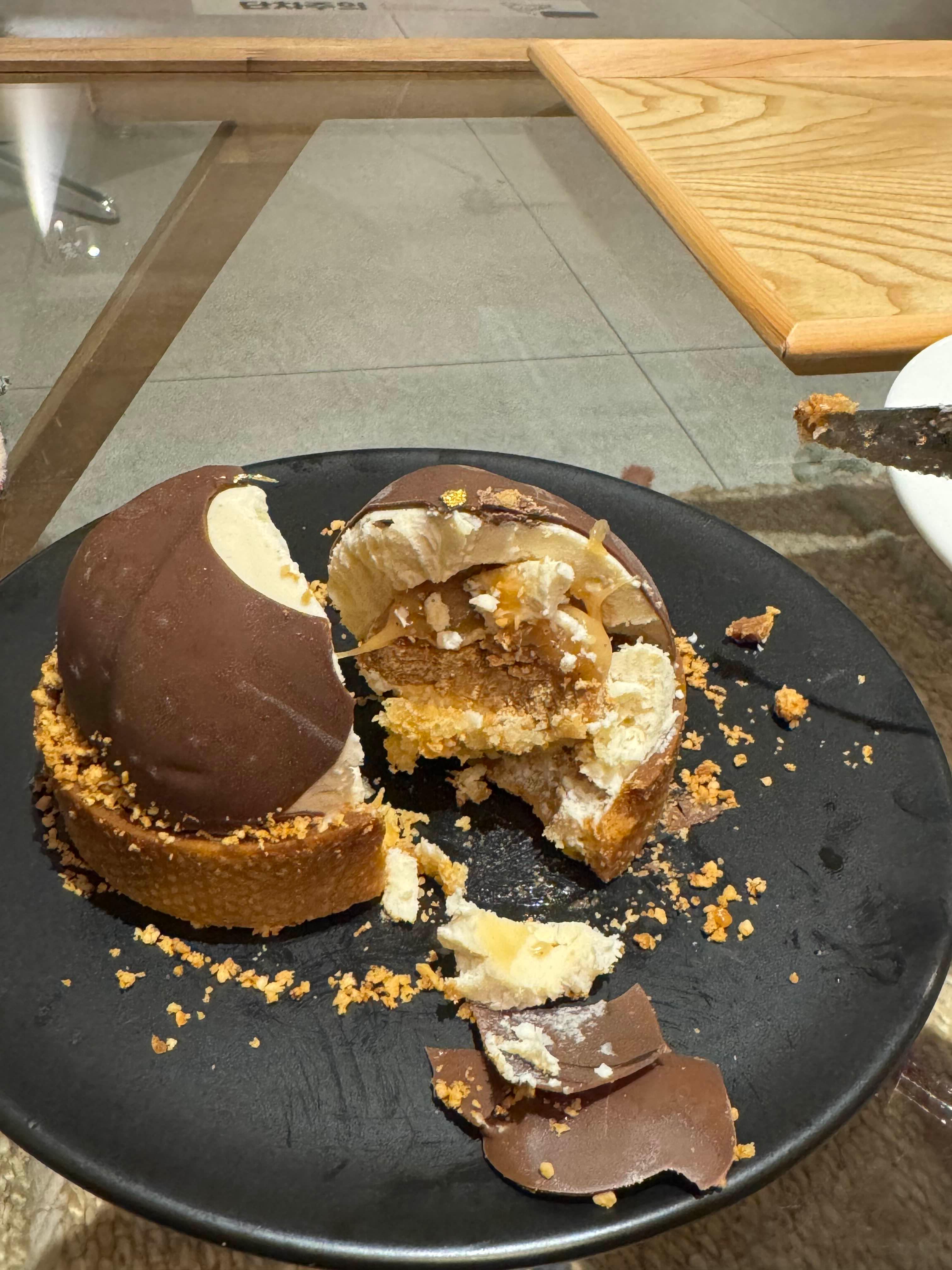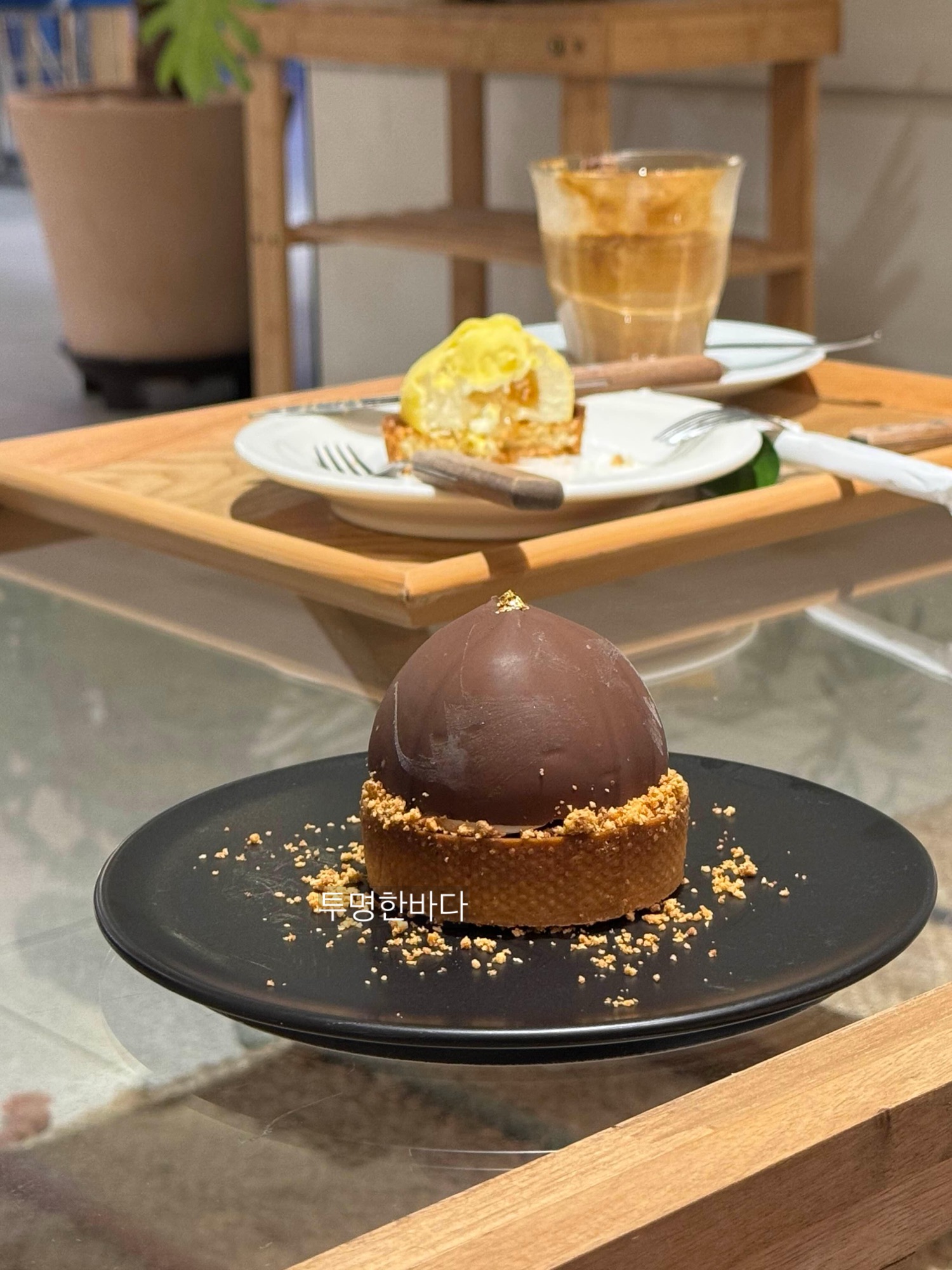 겉은 딱딱한 초코쉘과 안에는 헤이즐넛 무스크림과 직접 갈아넣은 헤이즐넛 프랄린, 땅콩?카라멜이 인서트로 들어있는 타르트입니다.유자레몬 무스케이크
