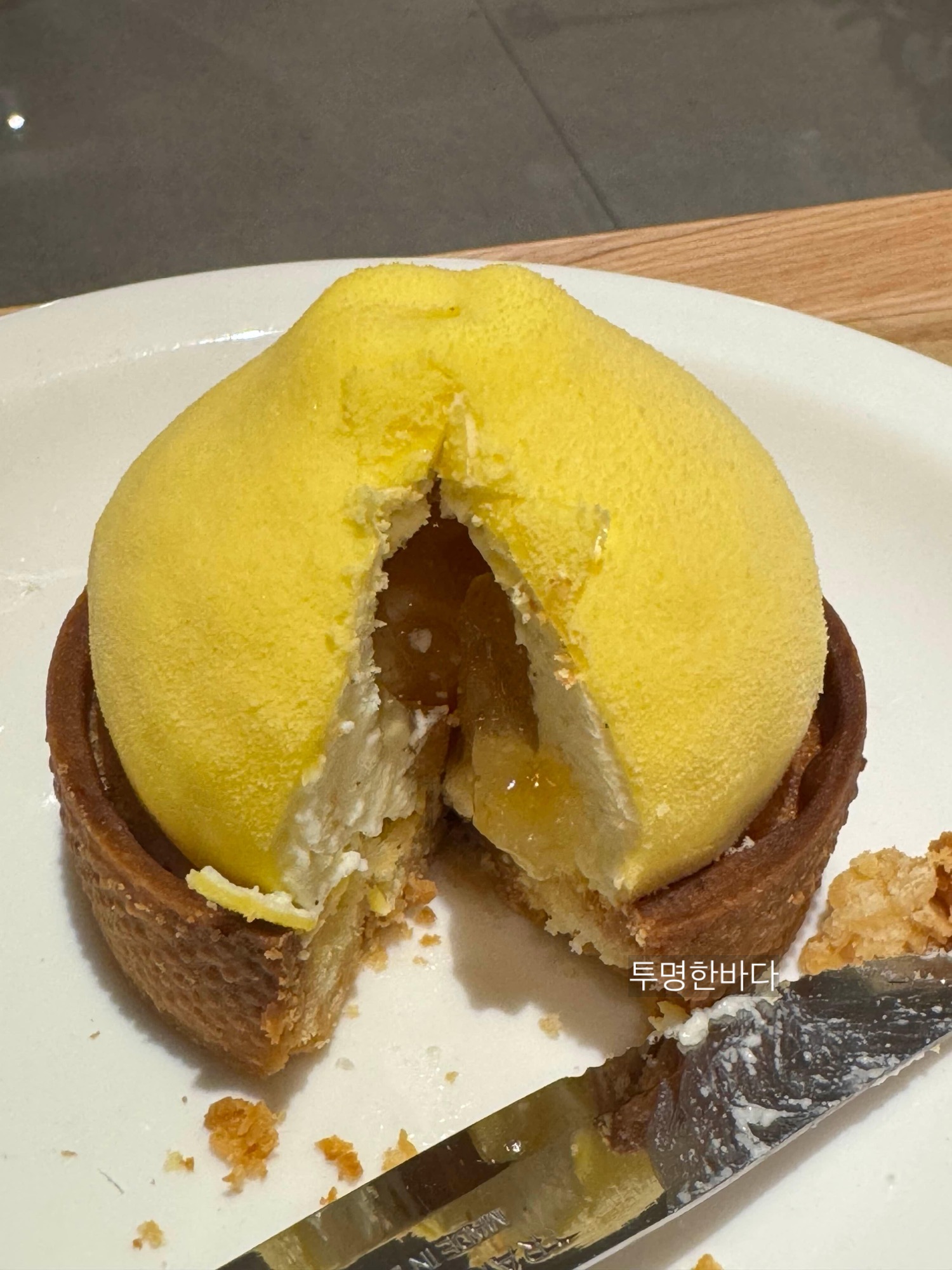 파트슈크레 위에 유자 레몬요거트크림 속 유자필 인서트가 들어가 있는 무스케이크 입니다.