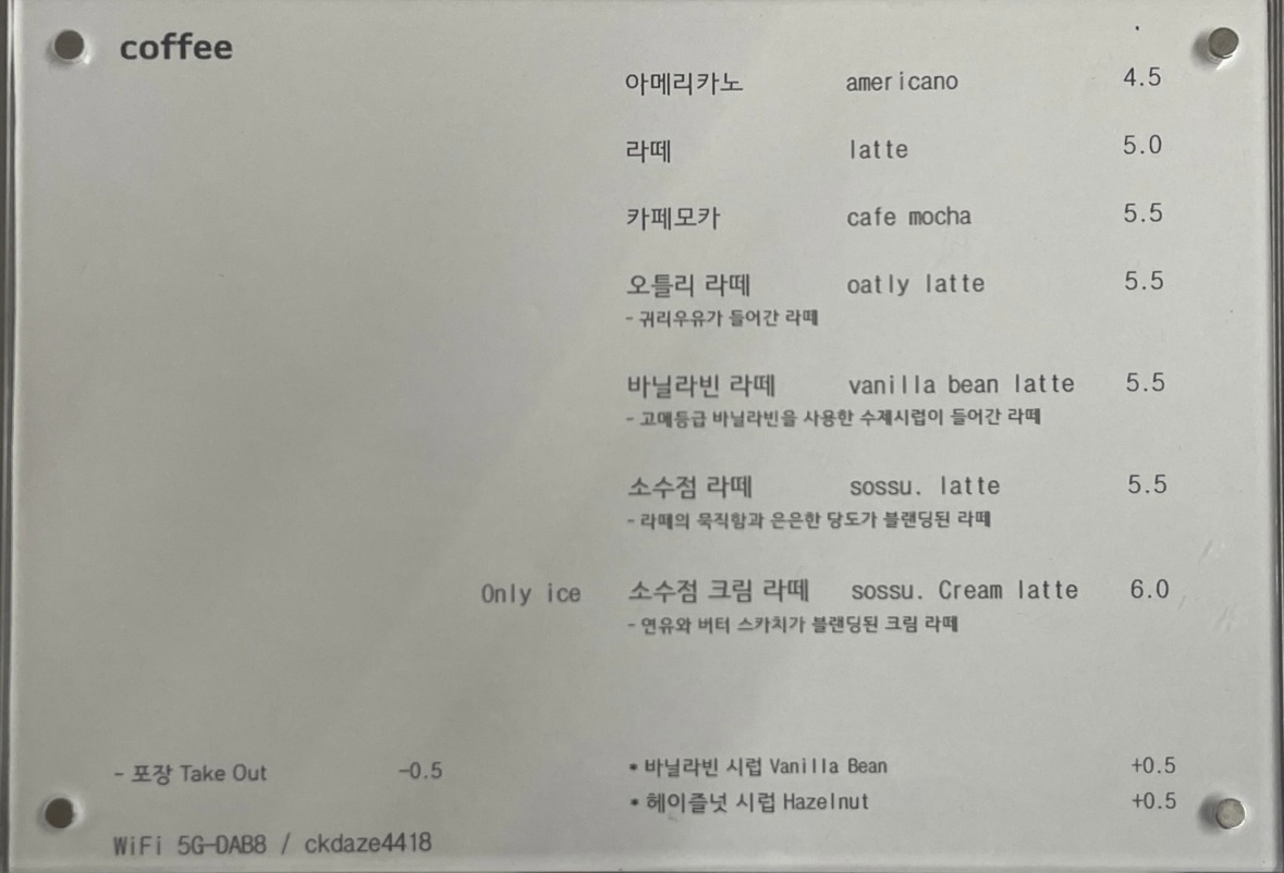 이 카페의 시그니처 메뉴인 소수점크림라떼는 정말 맛있습니다. 크림의 고소함과 커피의 조화가 일품이에요. 처음에는 섞지 않고 마시다가 나중에 섞어 마시면 두 가지 맛을 모두 즐길 수 있습니다.