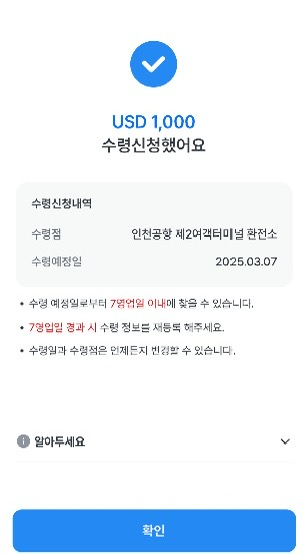 외화 수령은 반드시 본인이 해야 합니다. 대리 수령은 허용되지 않으므로 여행자 본인이 직접 공항을 방문해야 합니다.