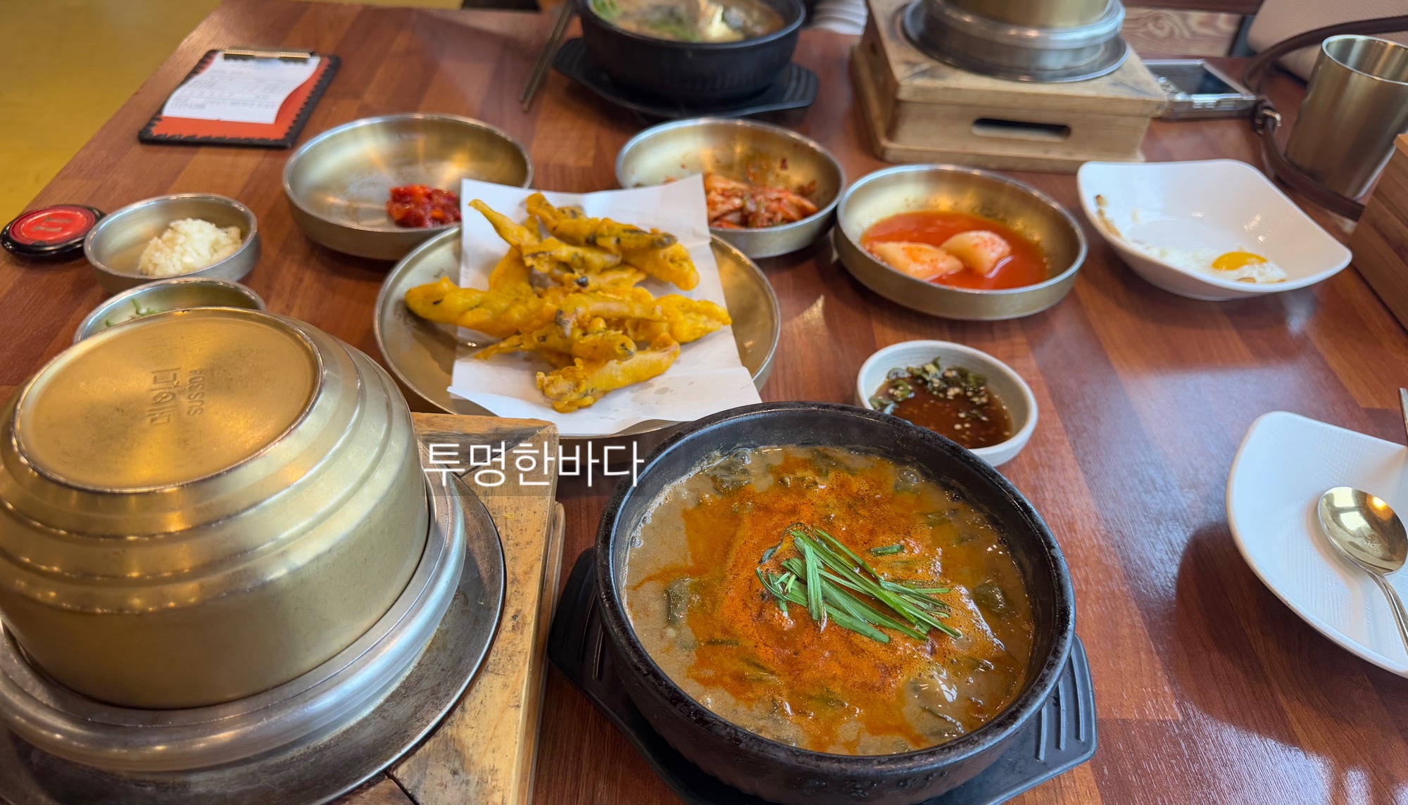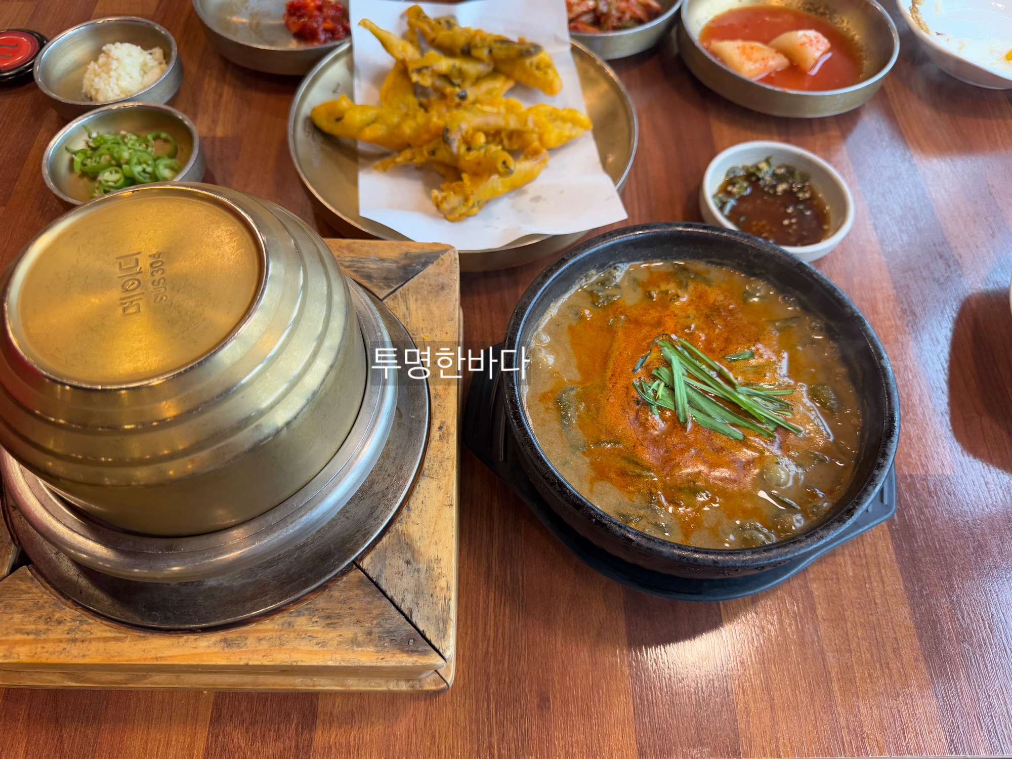 모든 메뉴에는 강황을 넣은 돌솥밥이 함께 제공됩니다. 이 돌솥밥의 누룽지는 특히 맛있다고 평가받고 있습니다