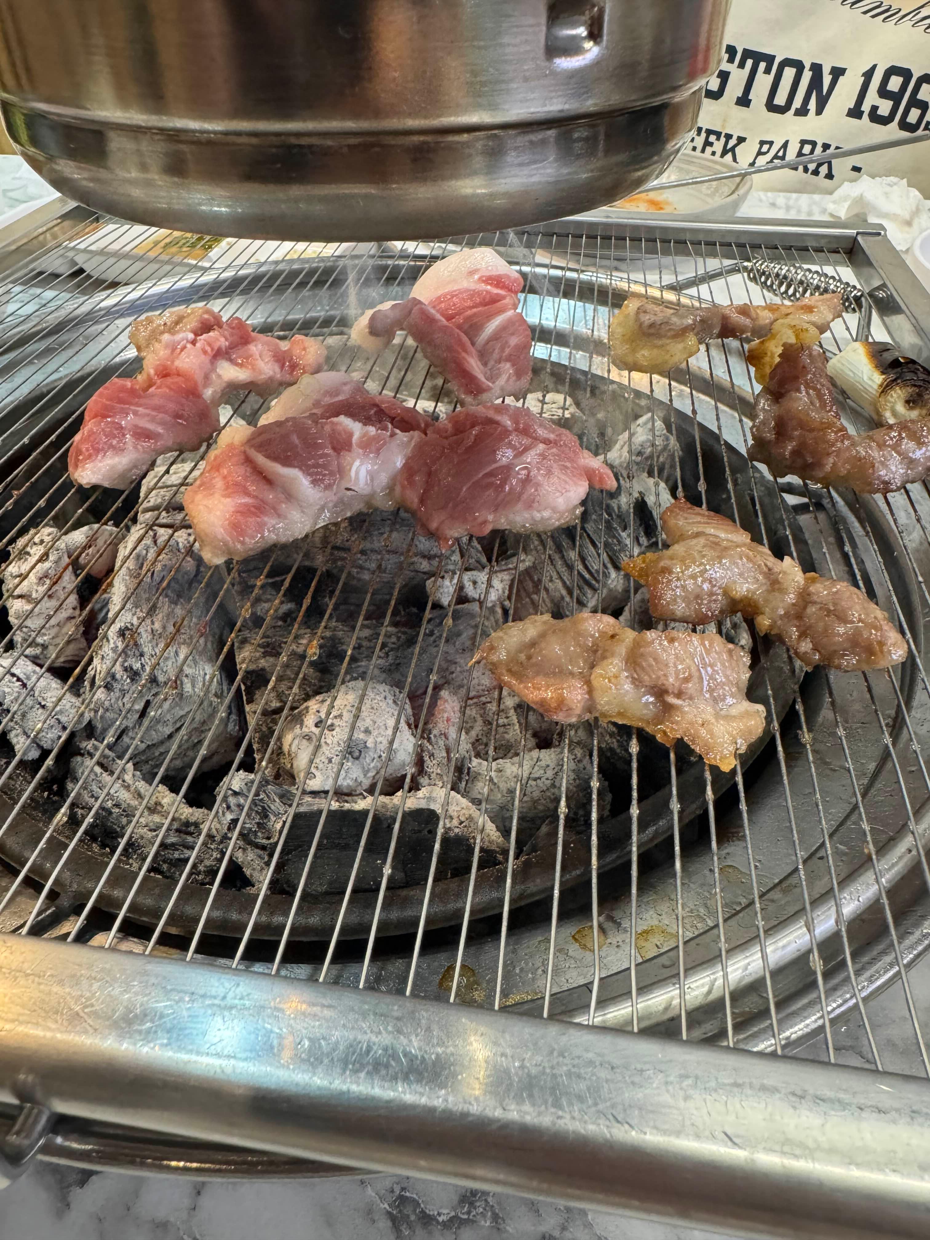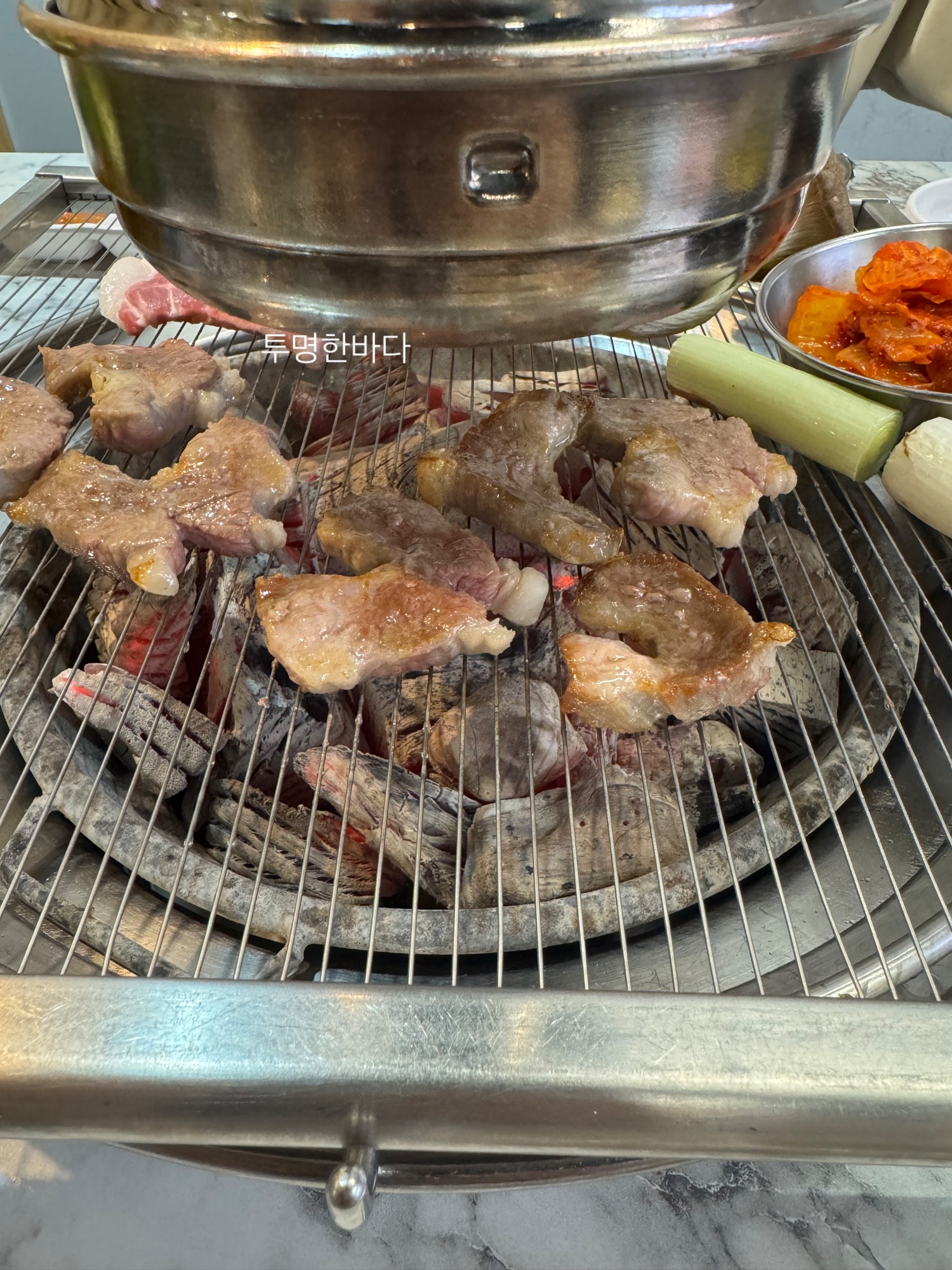 주문한 A코스의 주인공, 꼬들목살이 등장하면 두툼하게 썰린 고기 위에 껍데기 같은 부위가 붙어 있는 것이 특징입니다. 불판에 올려 마늘, 멜젓, 김치, 버섯과 함께 구우면, 고기에서 풍기는 고소한 향이 식욕을 자극합니다.