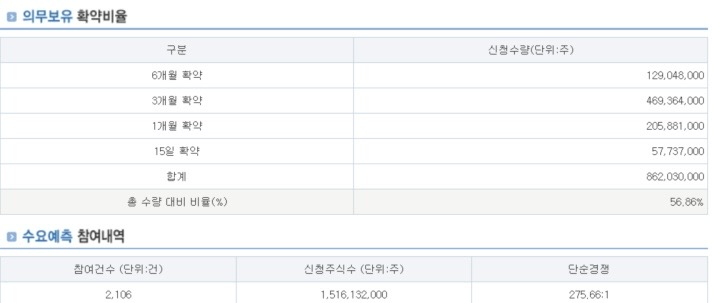 기관 수요예측 경쟁률은 275.66:1로 매우 높은 흥행을 기록하였고, 대부분 상단 가격에 몰려 공모가가 상단으로 확정되었습니다. 확약비율도 56.9%로 상당히 높게 나타났으며, 투자심리가 매우 우호적입니다.