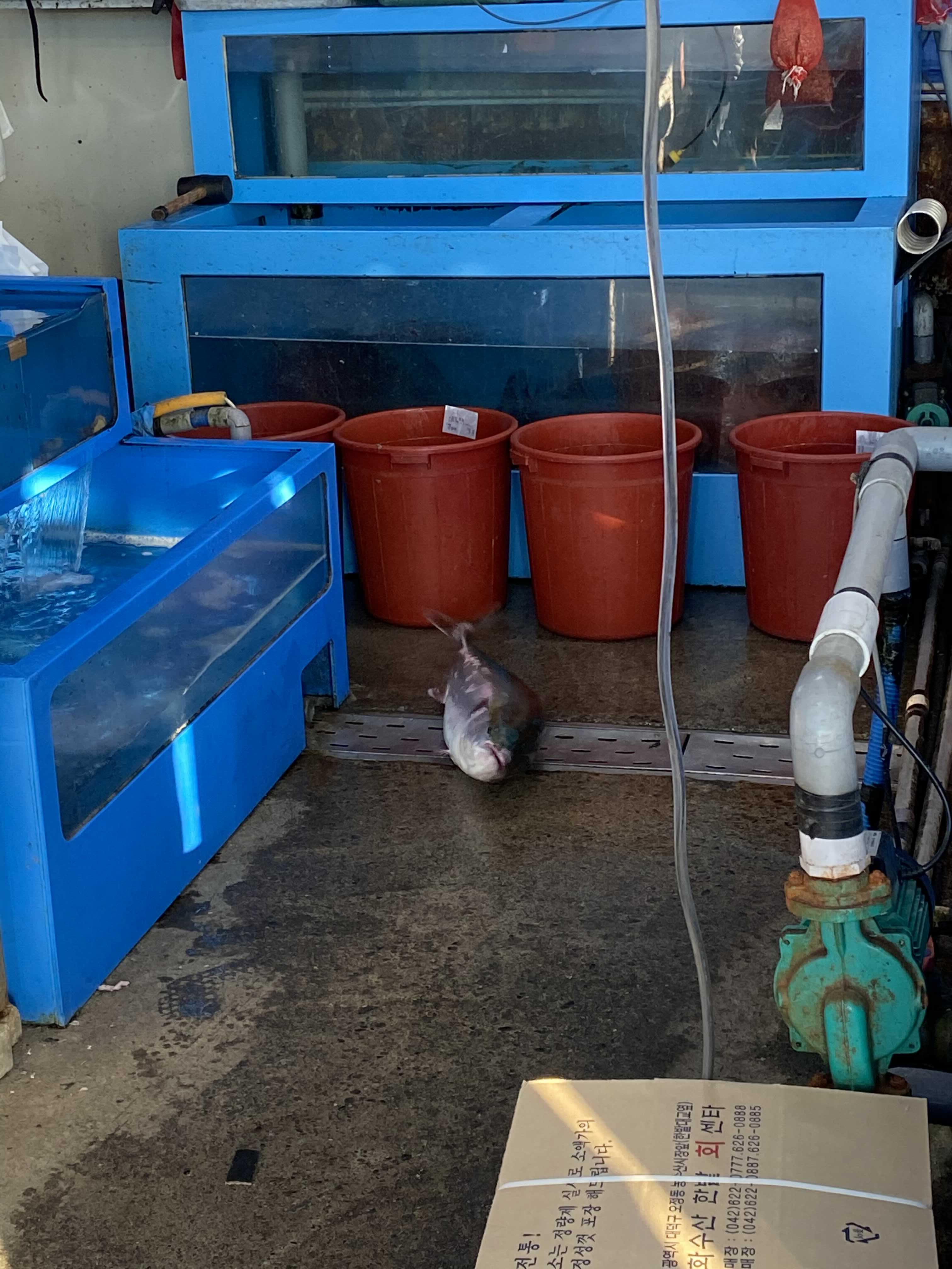 대방어가 한마리 탈출해서 바닥을 기고있네요