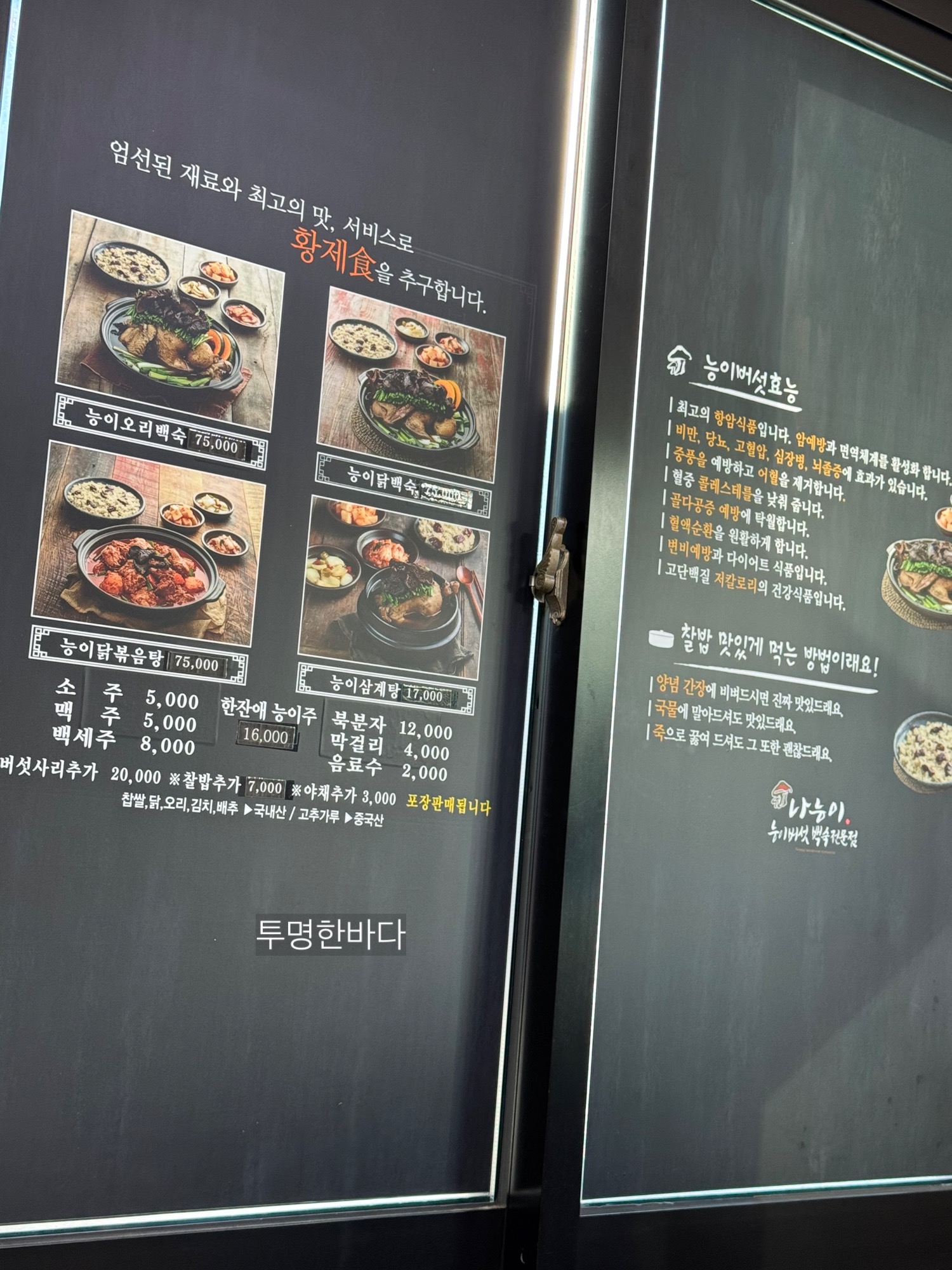 자, 메인 메뉴는 단연 능이버섯닭백숙과 능이버섯오리백숙!