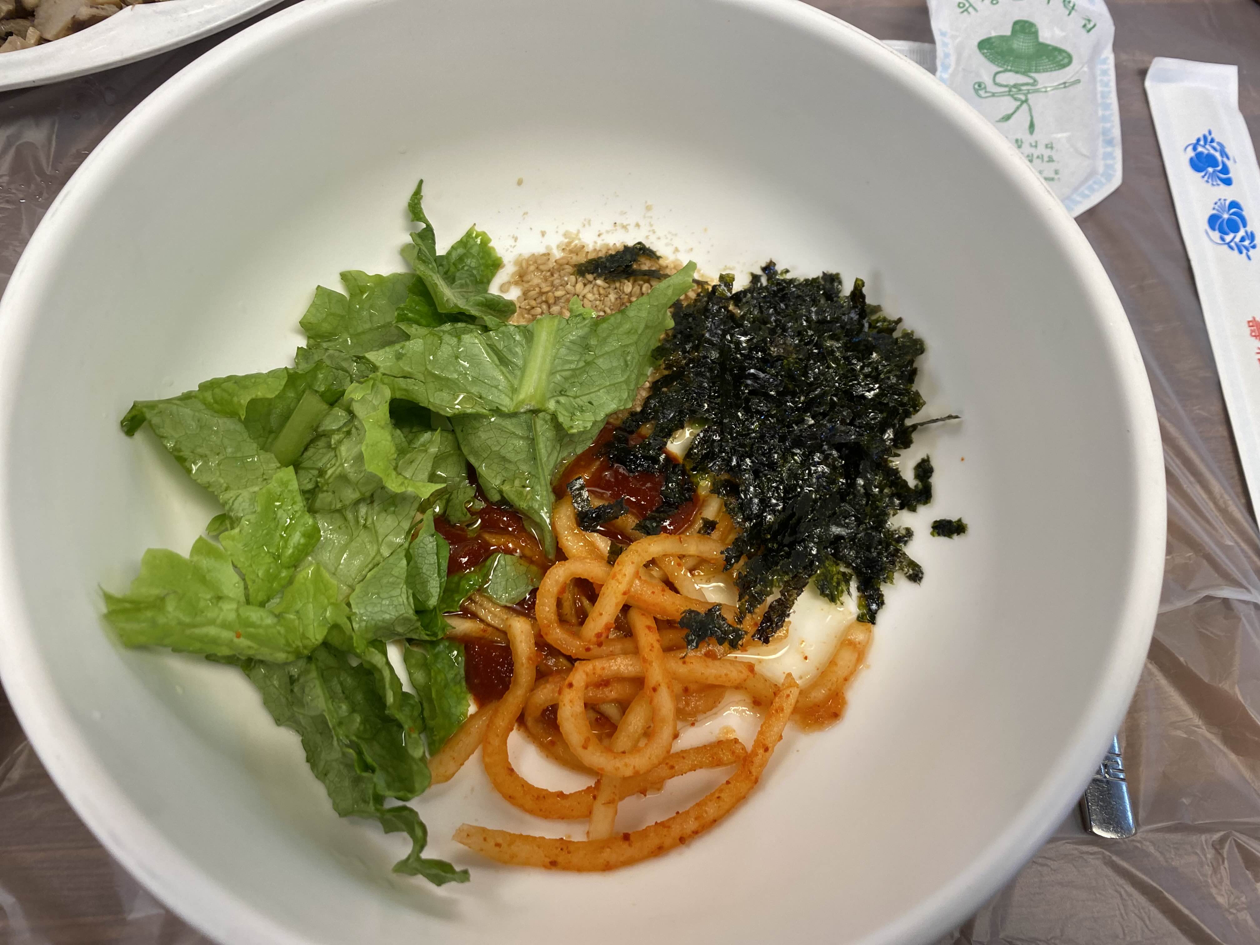 산채비빔밥은 기본 소스 야채에 추가적으로 나오는 나물들과 밥을 넣고 비벼먹게 되어있다