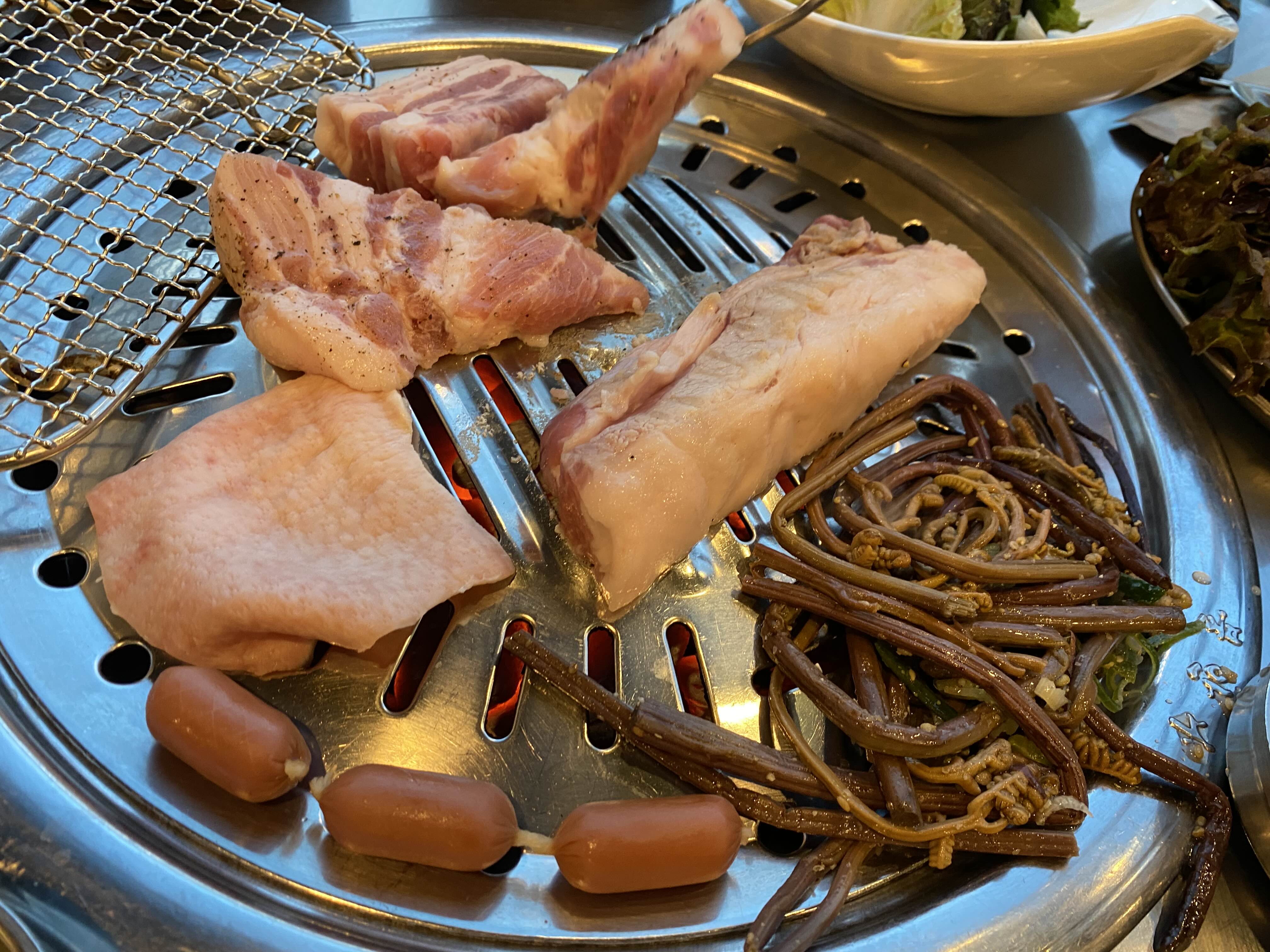 드디어 나온 고기를 불판에 올려봤습니다.