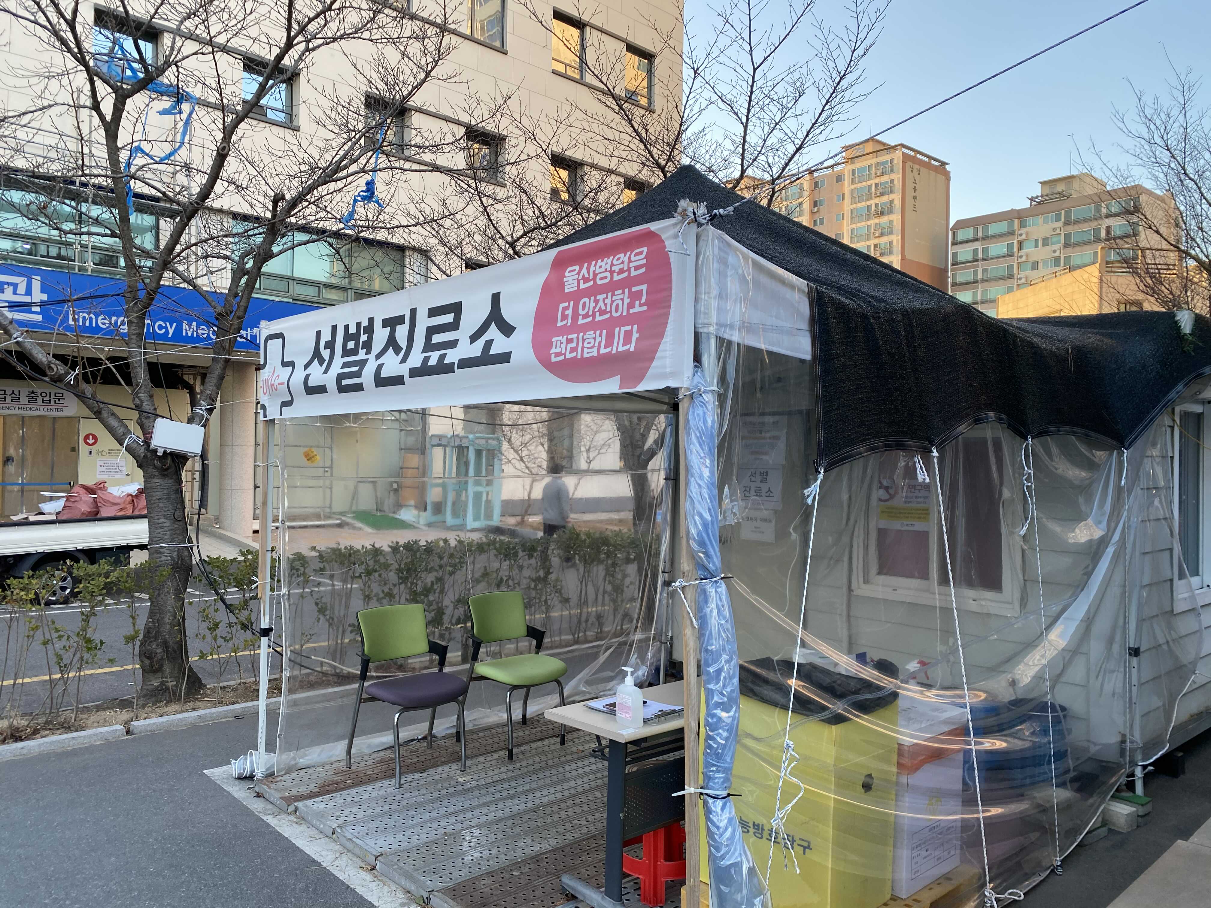 울산병원의 선별진료소는 공용주차장에 마련되어 있어요