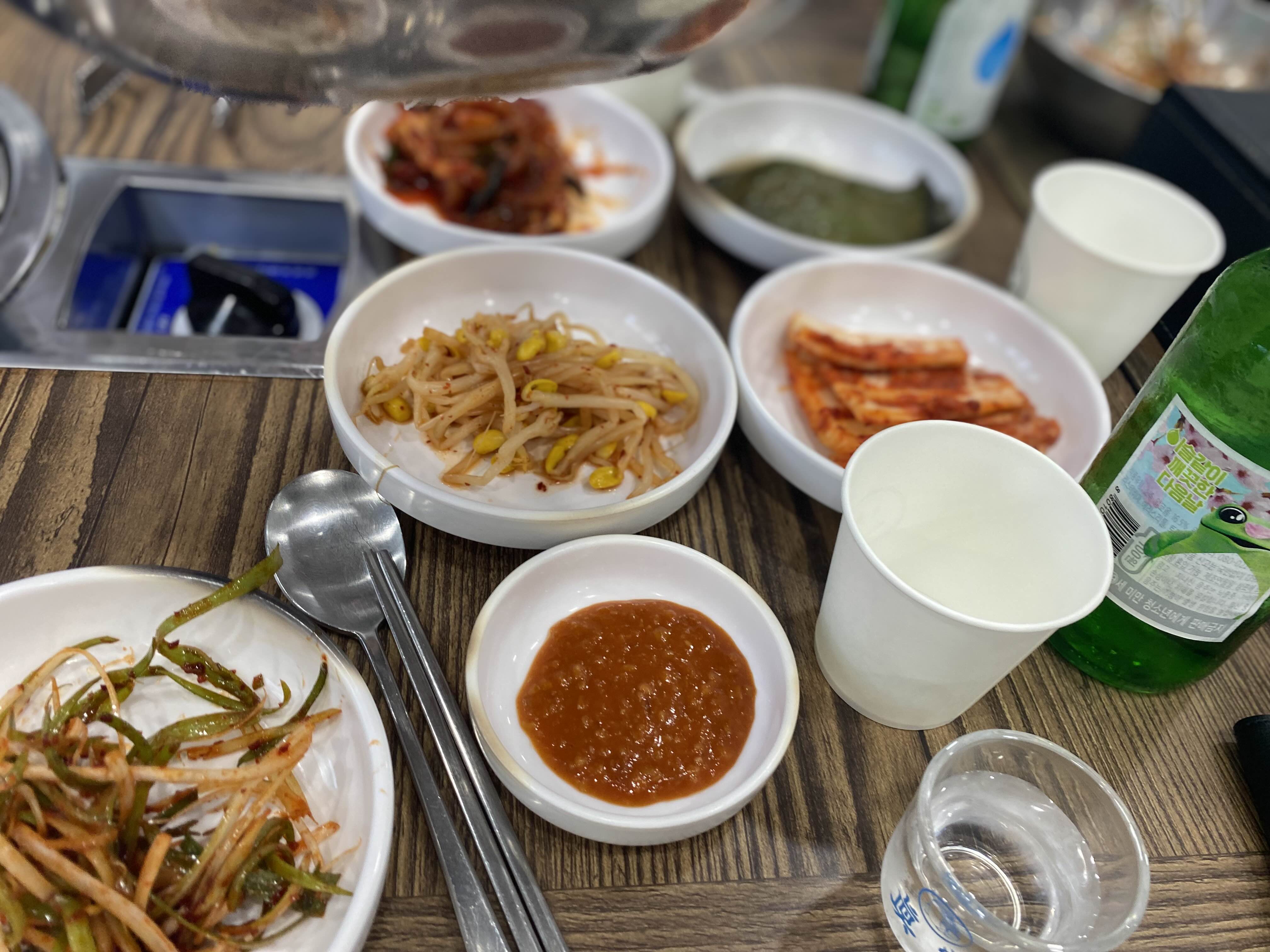 밑반찬은 김치 콩나물 계란찜 돼지껍데기무침 깻잎장아찌 상추쌈 파절이~