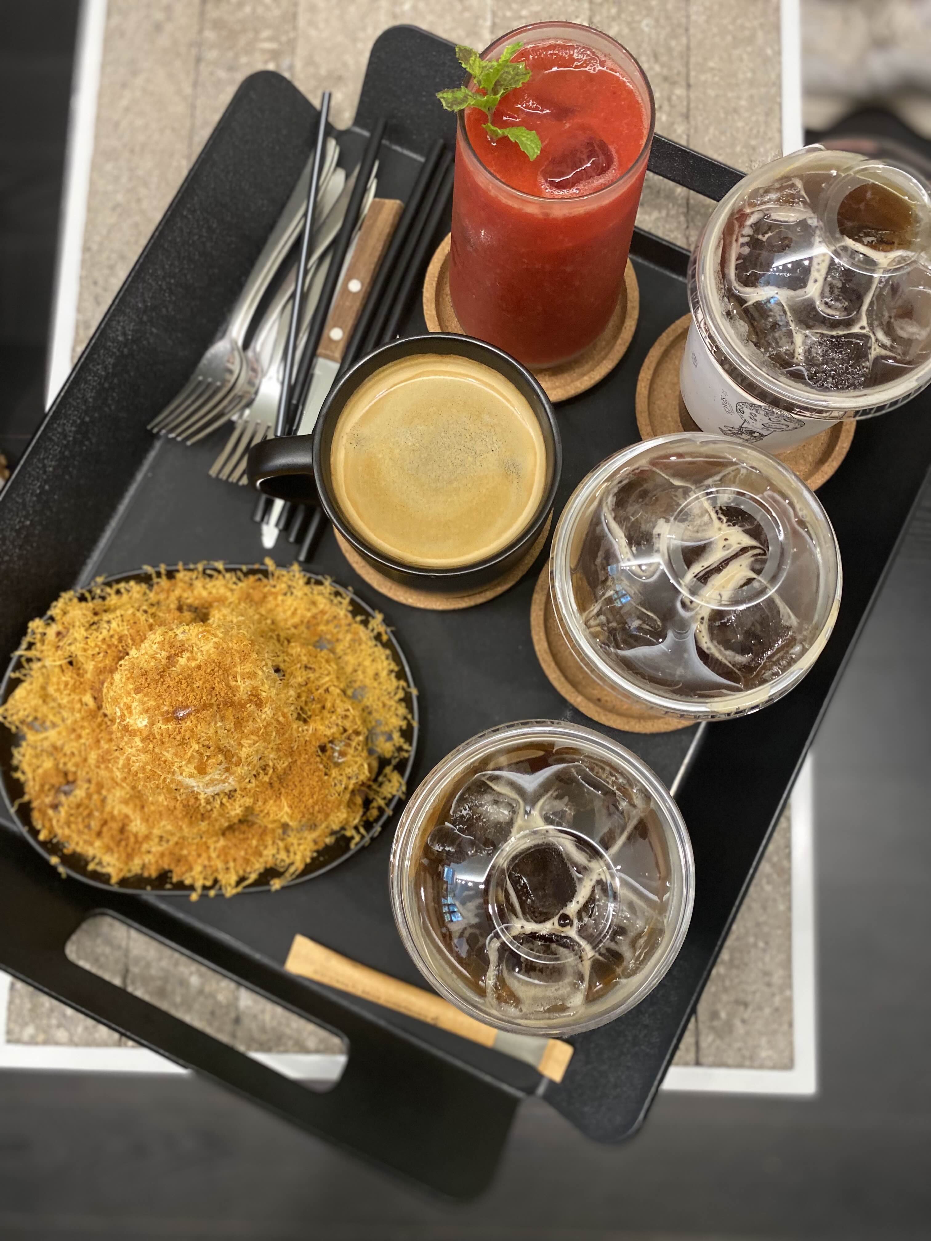 우리가 주문한 뜨아 아아와 딸기쥬스 그리고 플레이팅크로플