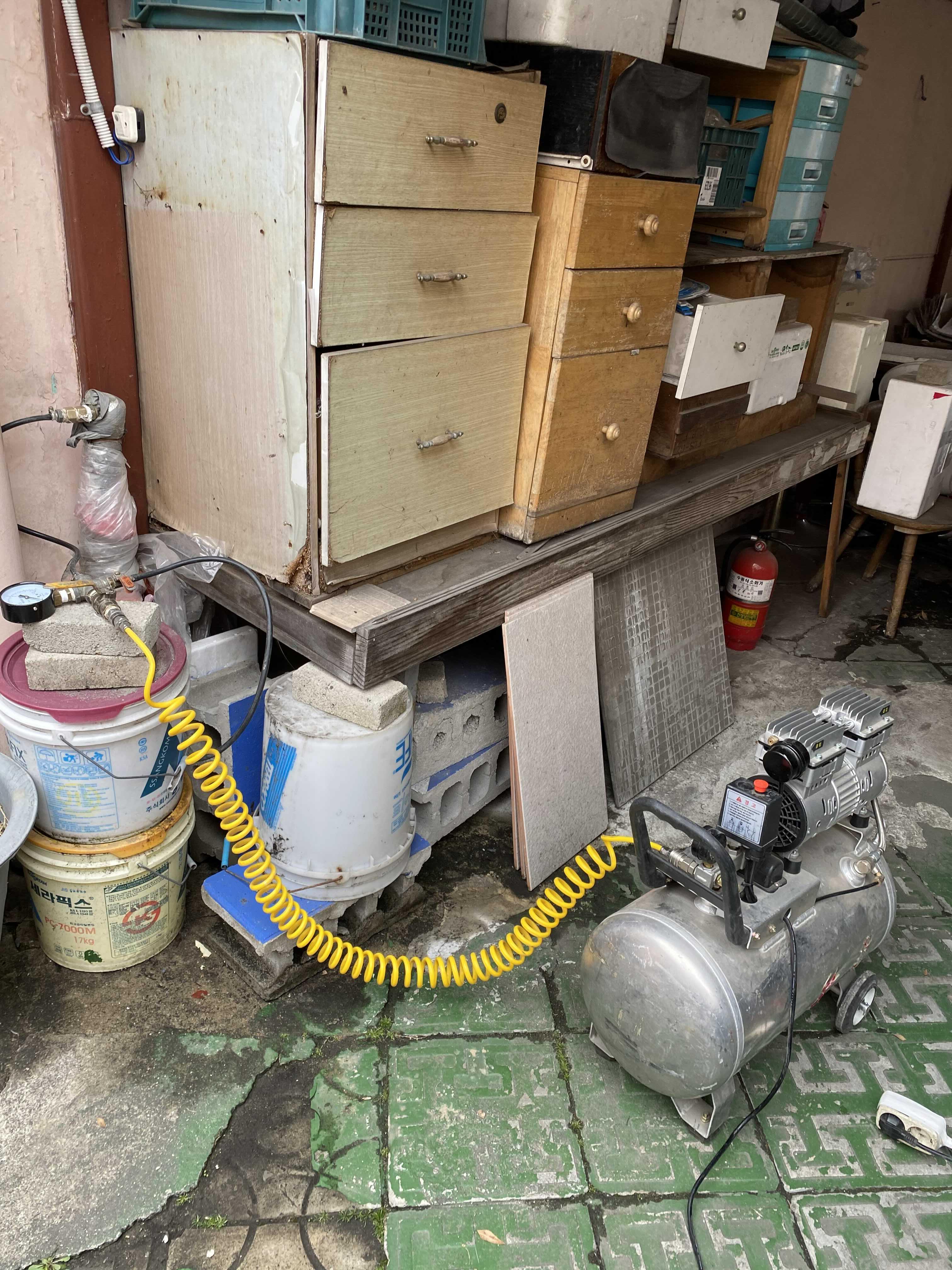 콤프레셔와 공기의 압력게이지를 이용하여 배관에 공기를 채운뒤 공기가 새는 곳을 찾아보려고 했지만, 범위가 꽤 넓어서 이 방법으로는 쉽게 찾아지지 않았어요.