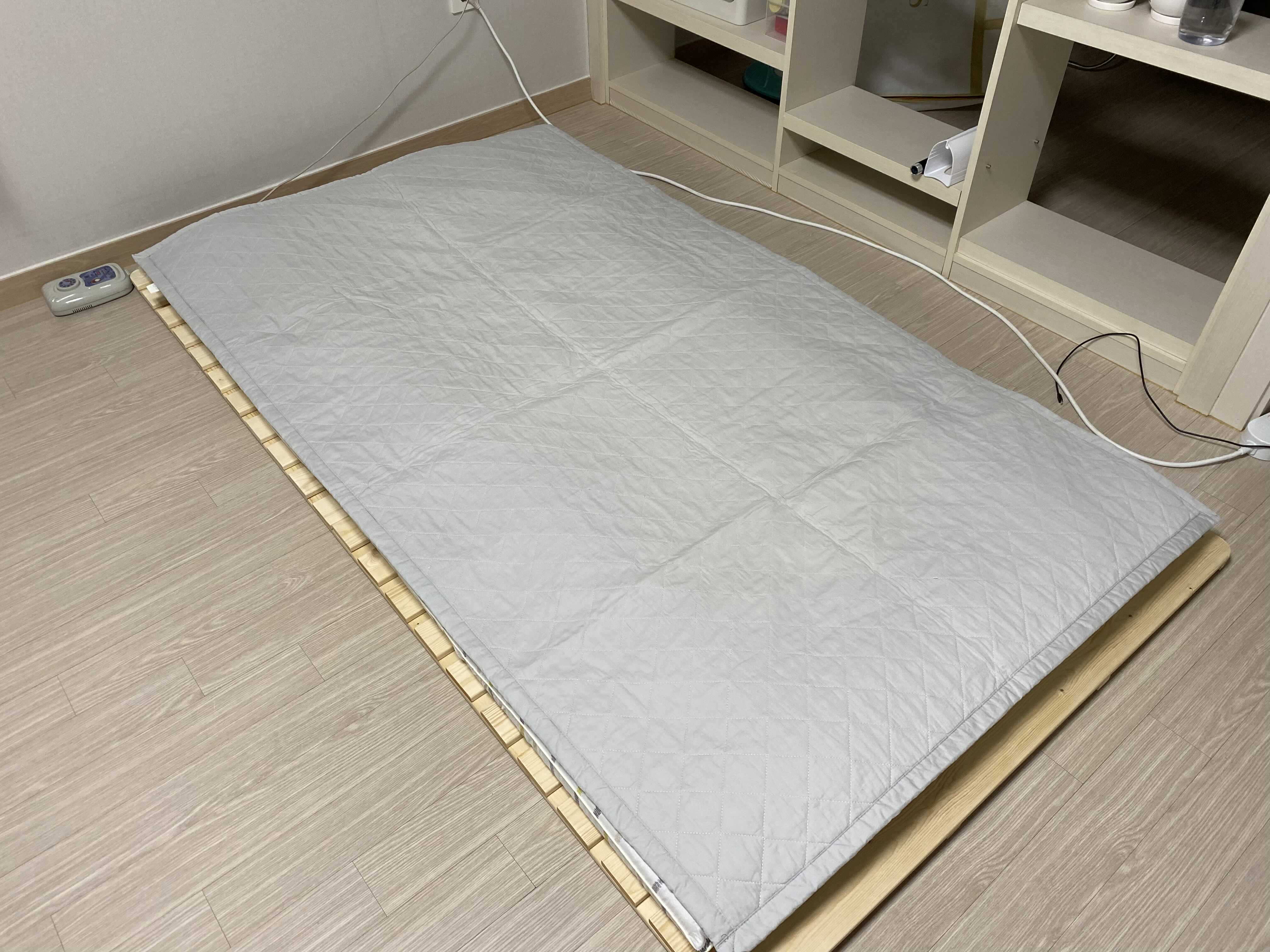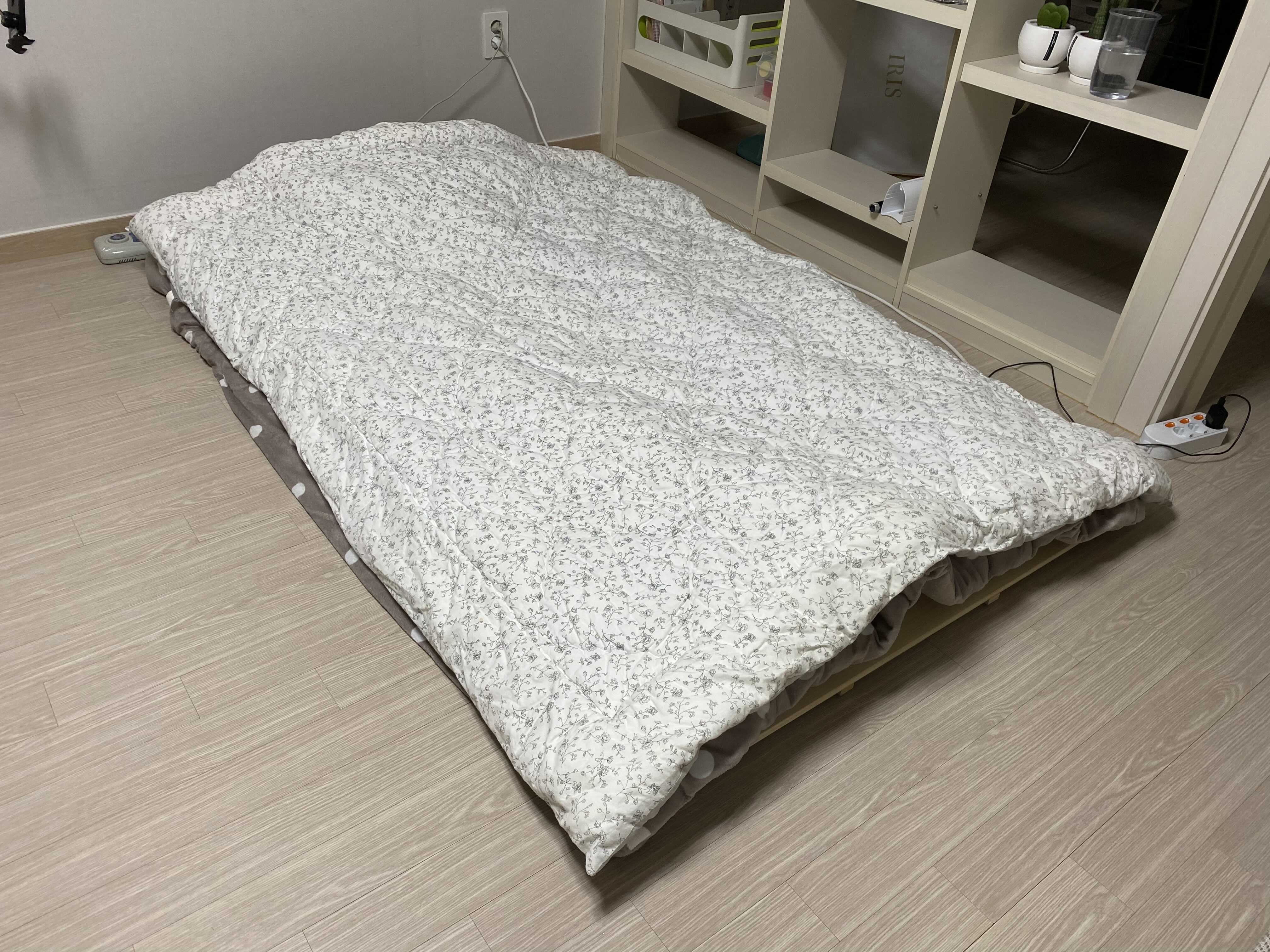 토퍼를 깔구, 그 위에 전기장판을 깔구, 얇은 요를 하나 더 깔아보았습니다.